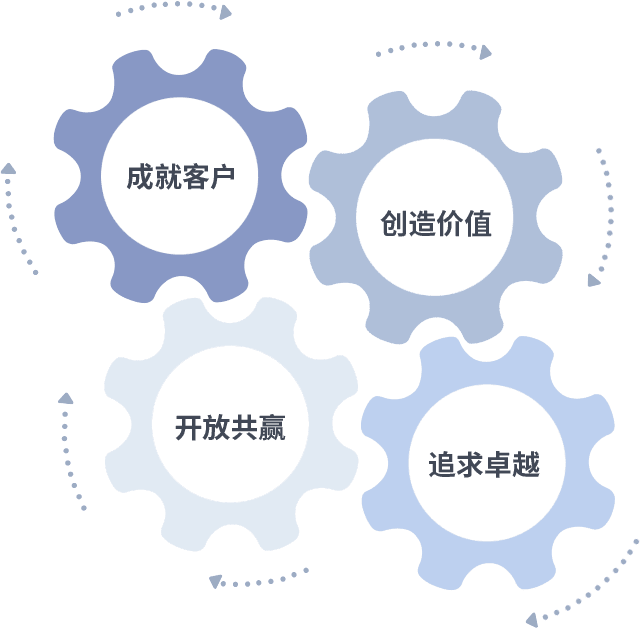 成就客户是一切决策的出发点,,,创造价值是衡量所有工作的标准,,追求卓越是我们做事做人的态度,,开放共赢是我们的格局也是最终的结果。。价值观的齿轮环环相扣,,推动着组织里的每个人不断向前。。